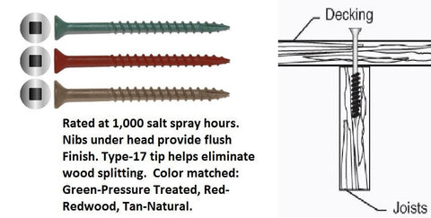 - For fastening wood decks. Nibs under the head help provide flush surface finish. Type-17 point prevents wood splitting. Long life 1000 Hour Ceramic Envirocoat prevents corrosion. Available in Green-Pressure Treated, Red, and Tan-Natural color. Please check size and color when making your selection. Ruspert is a premium coating that started out exclusively for industrial and automotive applications. It comes in many colors and is spread consistently on the fastener ensuring a smooth uniform thickness that prevents recess head and thread fill. The fastener is Zinc and Zinc Nickel plated before being electro coated to provide ultimate corrosion protection. The coating TMS uses for its fasteners withstands up to 1,000 hours of salt spray before starting to show signs of corrosion. This results in some of the best corrosion protection in the industry.